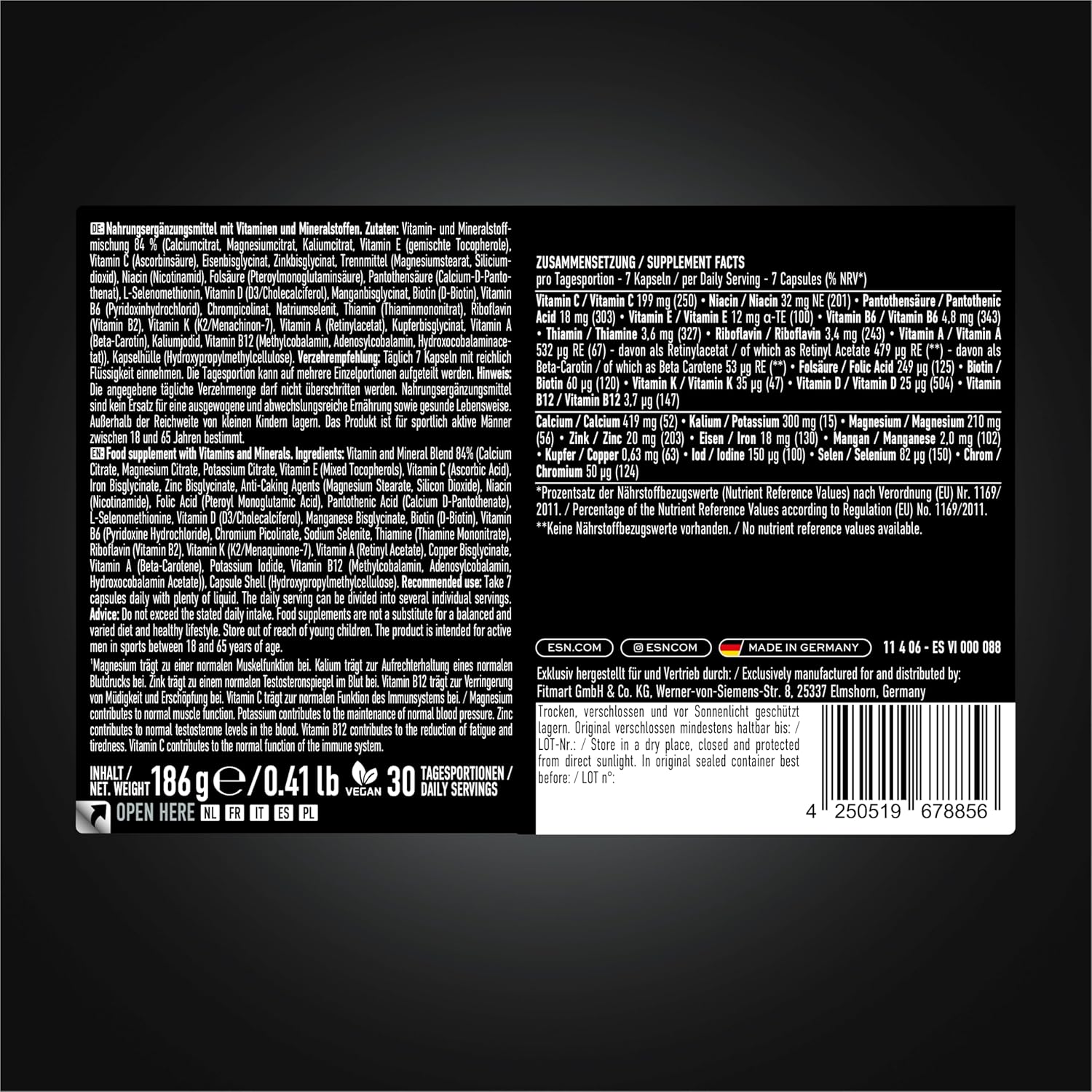 Vitamin- und Mineralstoffmischung [Calciumcitrat, Magnesiumcitrat, Kaliumcitrat, Vitamin C (L-Ascorbinsäure), Trennmittel (Magnesiumsalze der Speisefettsäuren, Siliciumdioxid), Eisenbisglycinat, Zinkbisglycinat, Vitamin E (gemischte Tocopherole), Niacin (Nicotinamid), Pantothensäure (Calcium-D-pantothenat), Vitamin B6 (Pyridoxinhydrochlorid), Kupferbisglycinat, Vitamin B1 (Thiaminmononitrat), Selenmethionin, Vitamin A (Retinylacetat, ß-Carotin), Vitamin B2 (Riboflavin), Chrompicolinat, Folsäure (6S-5- Methyltetrahydrofolsäure, Glucosaminsalz), Kaliumiodid, Natriumselenit, Biotin (D-Biotin), Vitamin D (Cholecalciferol), Vitamin K (Menachinon-7), Vitamin B12 (Methylcobalamin, 5 ́-Desoxyadenosylcobalamin, Hydroxocobalamin)], Kapselhülle (Überzugsmittel (Hydroxypropylmethylcellulose)).